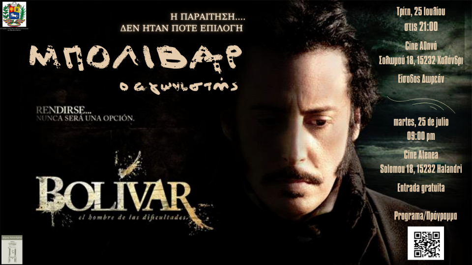 Η πρεσβεία της Μπολιβαριανής Δημοκρατίας της Βενεζουέλας στην Ελλάδα και ο Δήμος Χαλανδρίου, σε συνεργασία με τον θερινό κινηματογράφο «Cine Αθηνά», προβάλλουν την ταινία «Μπολίβαρ, ο αγωνιστής», με αφορμή τη συμπλήρωση των 240 ετών από τη γέννηση του απελευθερωτή της Βενεζουέλας, Σιμόν Μπολίβαρ, στις 24 Ιουλίου 1783, της σημαντικότερης φυσιογνωμίας στον αγώνα ανεξαρτησίας της Λατινικής Αμερικής.