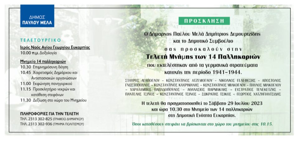 Ο Δήμαρχος Παύλου Μελά, Δημήτρης Δεμουρτζίδης, ο Αντιδήμαρχος Πολιτισμού – Αθλητισμού, Παντελής Νιγδέλης και το Δημοτικό Συμβούλιο, σας προσκαλούν στην καθιερωμένη ετήσια Τελετή Μνήμης των 14 Παλληκαριών που εκτελέστηκαν στην Ευκαρπία από τα γερμανικά στρατεύματα κατοχής και τους συνεργάτες τους.