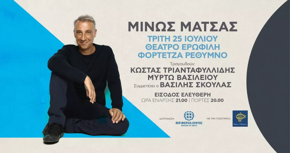 Ο βραβευμένος συνθέτης Μίνως Μάτσας έρχεται στις 25 Ιουλίου 2023 για μια μοναδική συναυλία στο Δημοτικό Θέατρο Ερωφίλη στο Ρέθυμνο στις 9 το βράδυ, σε διοργάνωση της Περιφέρειας Κρήτης και την υποστήριξη του Δήμου Ρεθύμνης.