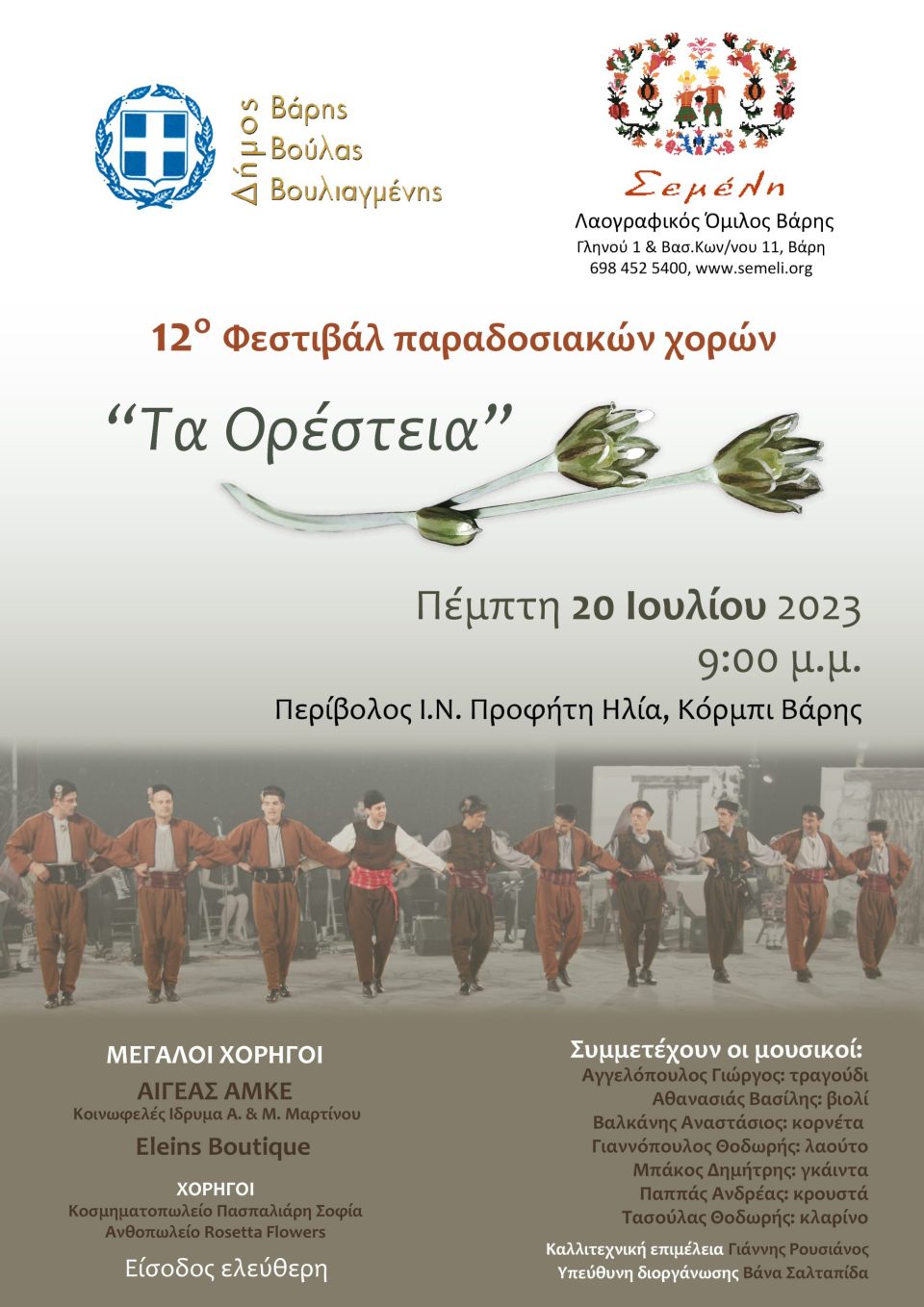 Ο Δήμος Βάρης Βούλας Βουλιαγμένης και το Τμήμα Πολιτισμού διοργανώνουν για 12η συνεχόμενη χρονιά Φεστιβάλ Παραδοσιακών Χορών «Τα Ορέστεια», την Πέμπτη 20 Ιουλίου, στις 21.00 στο Περίβολο του Ιερού Ναού Προφήτη Ηλία, στο Κόρμπι Βάρης.