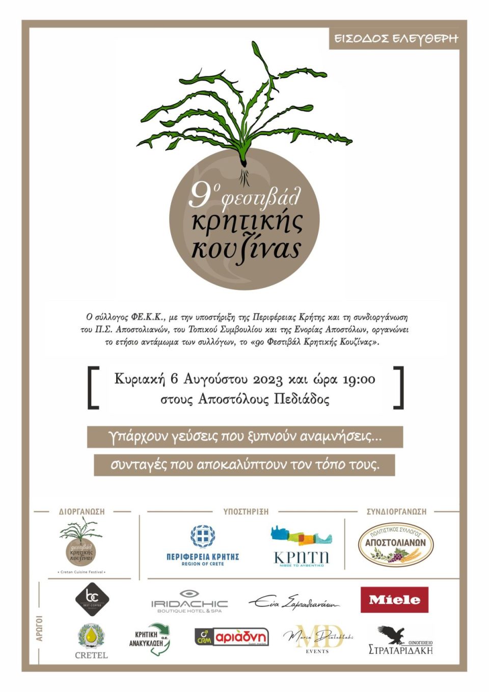 Ο σύλλογος ΦΕ.Κ.Κ., με την υποστήριξη της Περιφέρειας Κρήτης και τη συνδιοργάνωση του Π.Σ. Αποστολιανών, του Τοπικού Συμβουλίου και της Ενορίας Αποστόλων, οργανώνει την Κυριακή 6 Αυγούστου και ώρα 19:00, στo θεατράκι των Αποστόλων Πεδιάδος το ετήσιο αντάμωμα των συλλόγων, το «9ο Φεστιβάλ Κρητικής Κουζίνας».