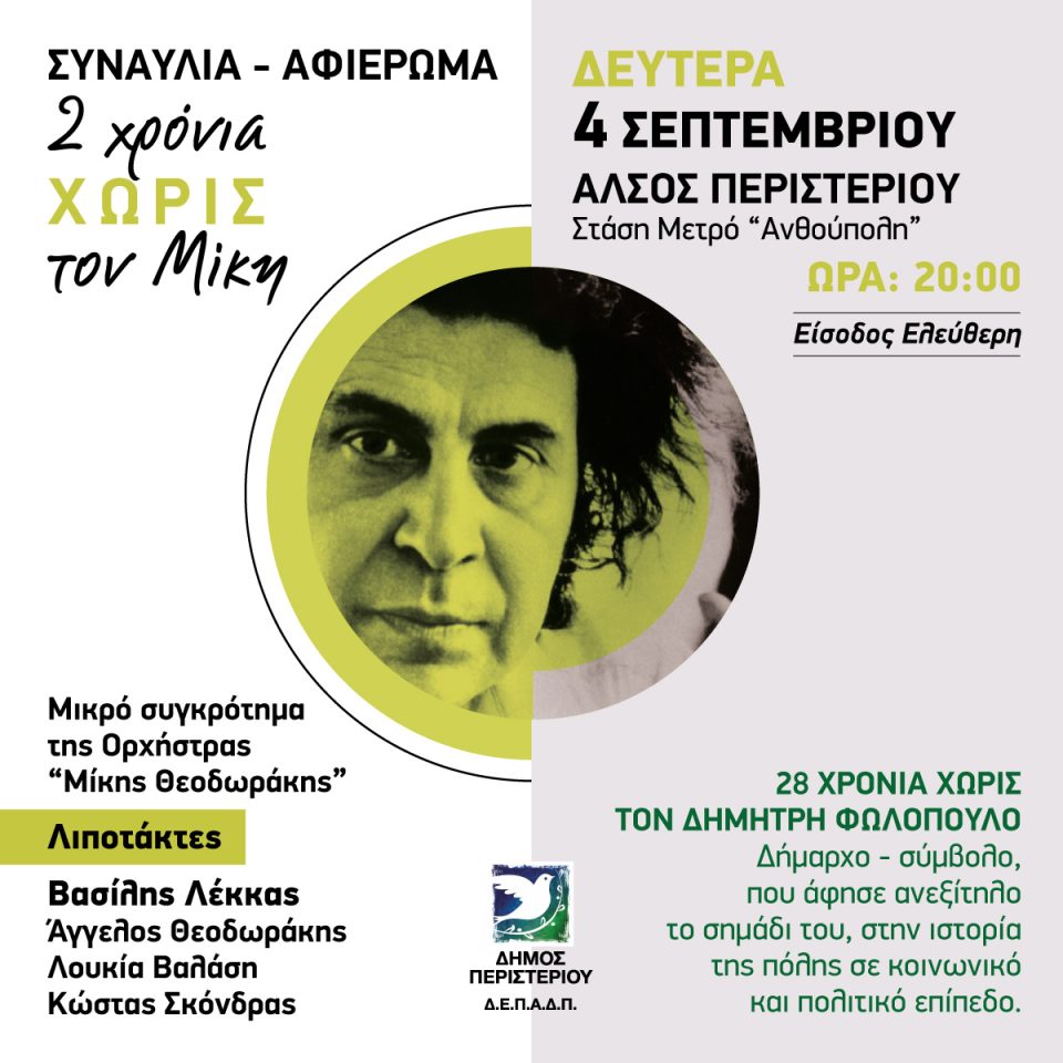Συναυλία «Δυο χρόνια χωρίς τον Μίκη», τη Δευτέρα 4 Σεπτέμβριου 2023, ώρα 20:00, στο Άλσος Περιστερίου, με το μικρό συγκρότημα της Ορχήστρας «Μίκης Θεοδωράκης» – «Λιποτάκτες», με ερμηνευτές Βασίλη Λέκκα, Άγγελο Θεοδωράκη, Λουκία Βαλάση και Κώστα Σκόνδρα. Είσοδος Ελεύθερη!Το πρόγραμμα της συναυλίας με το μικρό συγκρότημα της Ορχήστρας «Μίκης Θεοδωράκης» – Λιποτάκτες είναι αφιερωμένο στα πιο αγαπημένα και γνωστά λαϊκά, αλλά και λυρικά τραγούδια του συνθέτη.«Λιποτάκτες»: Πιάνο: Ευαγγελία Μαυρίδου, Κιθάρα: Νίκος Γκιόλιας, Πνευστά: Ξενοφών Συμβουλίδης, Μπάσο: Θοδωρής Κουέλης, Κρουστά: Στέφανος Θεοδωράκης – Παπαγγελίδης, Ηχοληψία: Μιχάλης Αλεξάκης και Υπεύθυνη παραγωγής: Sophie Hayes.Στο πλαίσιο της συναυλίας, ο Δήμος Περιστερίου θα πραγματοποιήσει ένα ξεχωριστό τιμητικό αφιέρωμα με τίτλο «28 χρόνια χωρίς τον Δημήτρη Φωλόπουλο», τον Δήμαρχο Περιστερίου – σύμβολο, που άφησε ανεξίτηλο το σημάδι του, στην ιστορία της πόλης σε κοινωνικό και πολιτικό επίπεδο.