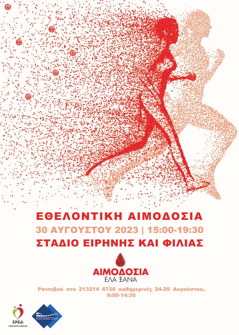 ΚεντρικήΚοινωνικάΕ.ΚΕ.Α.: Δράση αιμοδοσίας by xristiana29 Αυγούστου 202329 Αυγούστου 20230447 Share00 29/8/2023 Μια σημαντική δράση εθελοντικής αιμοδοσίας διοργανώνει το Εθνικό Κέντρο Αιμοδοσίας την Τετάρτη 30.8 15.00-19,30 στο Στάδιο Ειρήνης και φιλίας. Πληροφορίες στην αφίσα. Πηγή: https://www.xtypos.gr
