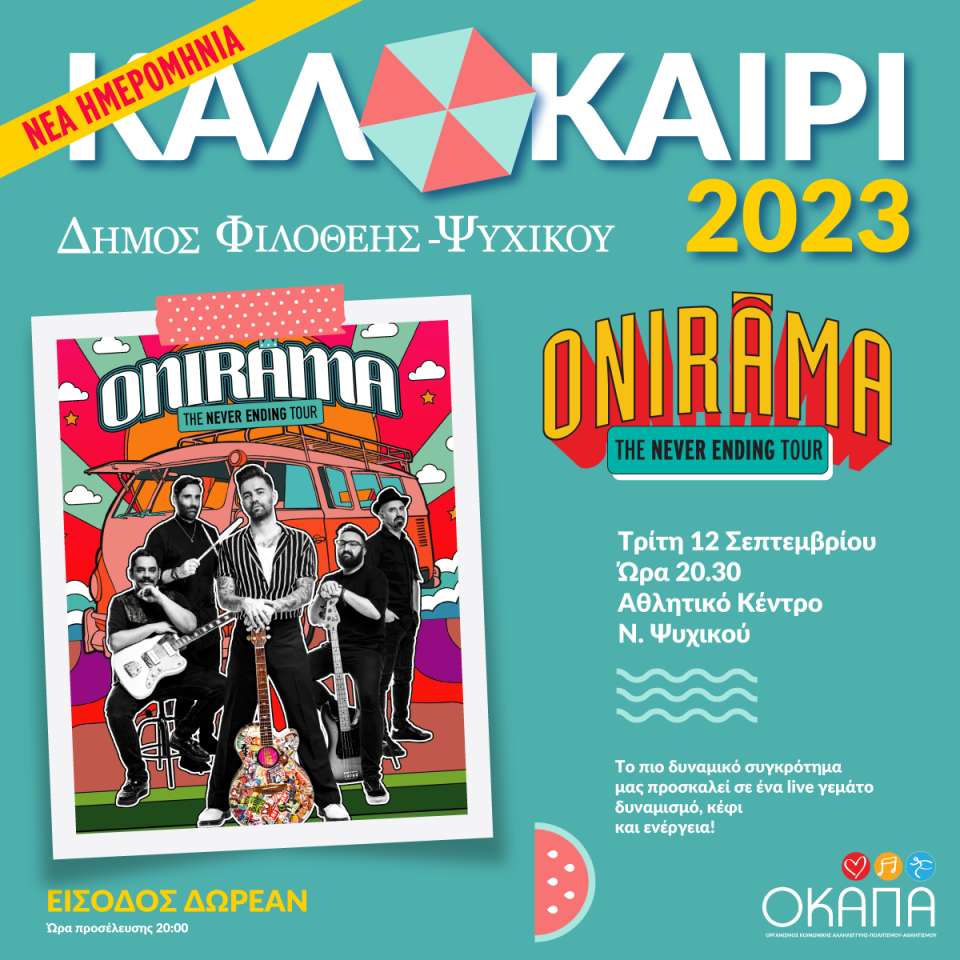 Η Συναυλία των ONIRAMA, που επρόκειτο να πραγματοποιηθεί στο Δήμο Φιλοθέης – Ψυχικού και αναβλήθηκε λόγω των πυρκαγιών μεταφέρθηκε σε νέα ημερομηνία διεξαγωγής: