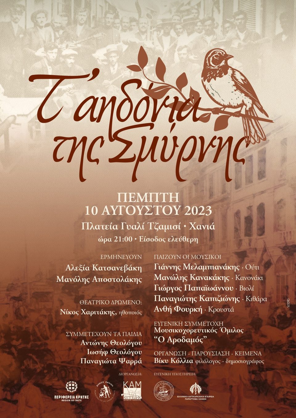 Ένα αφιέρωμα στους Σμυρναίους Μουσικούς Καλλιτέχνες, με εξαίρετους εξειδικευμένους και διακεκριμένους Μουσικούς από όλη την Κρήτη. Μια παράσταση που αποτυπώνει το κλίμα και την ατμόσφαιρα της εποχής πριν και μετά την Μικρασιατική Καταστροφή.
