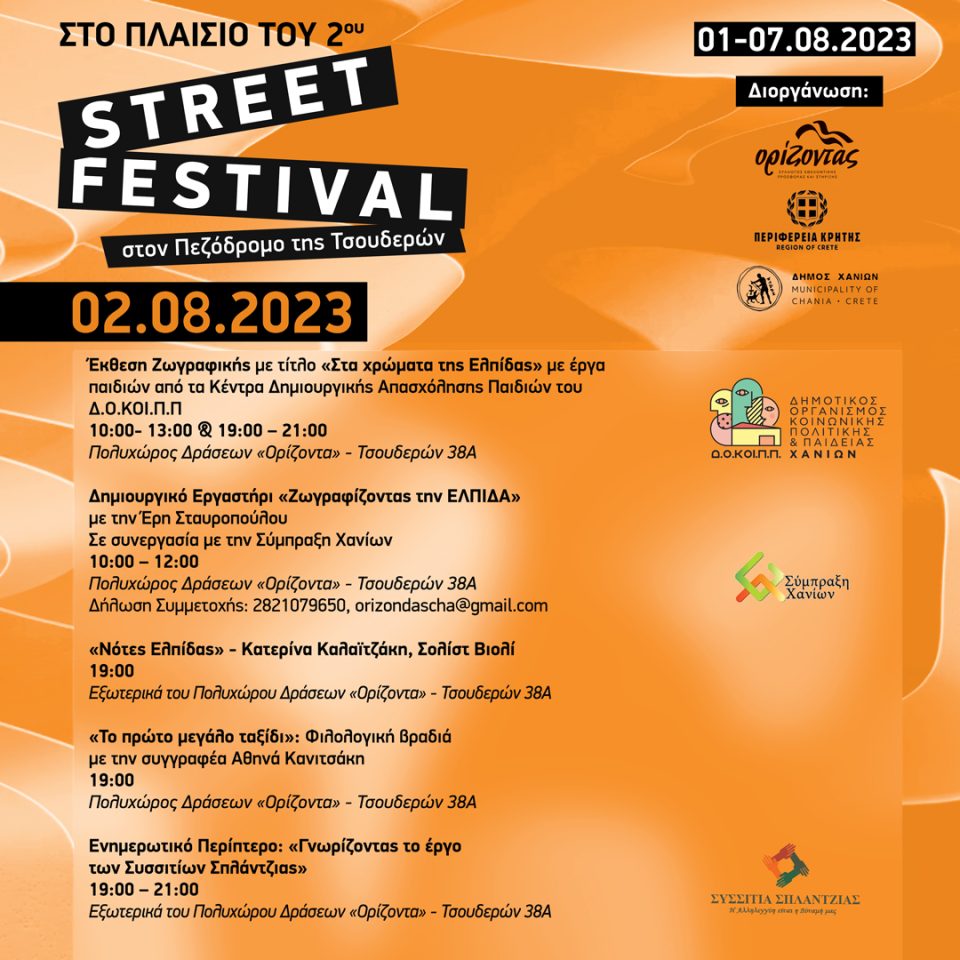 Ο Σύλλογος «Ορίζοντας», με το Τμήμα Κοινωνικής Πολιτικής του Δήμου Χανίων και την Περιφερειακή Ενότητα Χανίων – Περιφέρεια Κρήτης, διοργανώνουν για δεύτερη χρονιά το Street Festival στον Πεζόδρομο της Τσουδερών, από 1 έως 7 Αυγούστου, με σκοπό την προώθηση του εθελοντισμού μέσα από κοινωνικές και πολιτιστικές εκδηλώσεις.