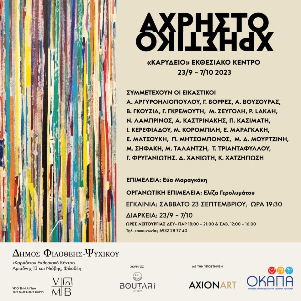 H Ομαδική Έκθεση Σύγχρονης Τέχνης με θέμα «Άχρηστο – Χρηστικό» διοργανώνεται στο «ΚΑΡΥΔΕΙΟ» Εκθεσιακό Κέντρο στην Φιλοθέη, με την υποστήριξη του ΟΚΑΠΑ Φιλοθέης-Ψυχικού και της ανοιχτής καλλιτεχνικής ομάδας AxionArt, με την συμμετοχή καλλιτεχνών που κατοικούν στον Δήμο Φιλοθέης-Ψυχικού.