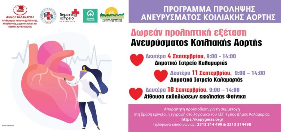 Ο προληπτικός έλεγχος Ανευρύσματος Κοιλιακής Αορτής θα πραγματοποιηθεί τη Δευτέρα 4 και 11 Σεπτεμβρίου στο Δημοτικό Ιατρείο Καλαμαριάς και τη Δευτέρα 18 Σεπτεμβρίου στην Αίθουσα εκδηλώσεων του Ιερού Ναού Κοιμήσεως της Θεοτόκου στο Φοίνικα και ώρες 9:00 -14:00 υπό την ιατρική επίβλεψη του έμπειρου επιστήμονα κου Ιωάννη Παπαδημητρίου.