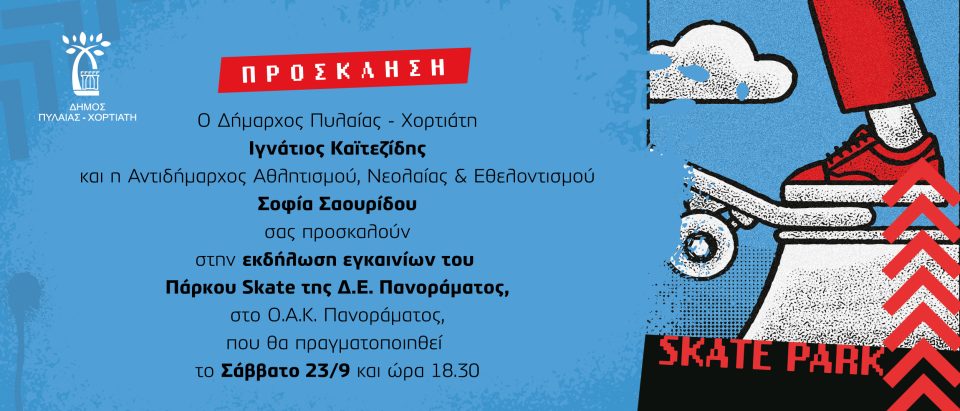 ΜΕ ΕΝΑ ΠΑΡΤΙ για μικρούς και μεγάλους λάτρεις του Skateboard θα γιορτάσει ο δήμος Πυλαίας – Χορτιάτη τα εγκαίνια του πάρκου Skate στο Ολυμπιακό Αθλητικό Κέντρο Πανοράματος που ανακαινισμένα και αναβαθμισμένα παραδίδονται πλέον στους δημότες.