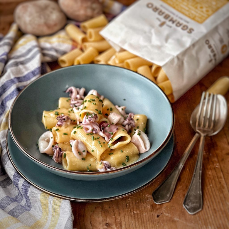Ταυτόχρονα βράζουμε τα ζυμαρικά σε άφθονο ελαφρά αλατισμένο νερό σύμφωνα με τις οδηγίες της συσκευασίας. Και όταν είναι έτοιμα τα στραγγίζουμε και τα μεταφέρουμε στην κατσαρόλα με τα καλαμαράκια. Τέλος προσθέτουμε την κρέμα πατάτας και ανακατεύουμε τα πάντα σε χαμηλή φωτιά.