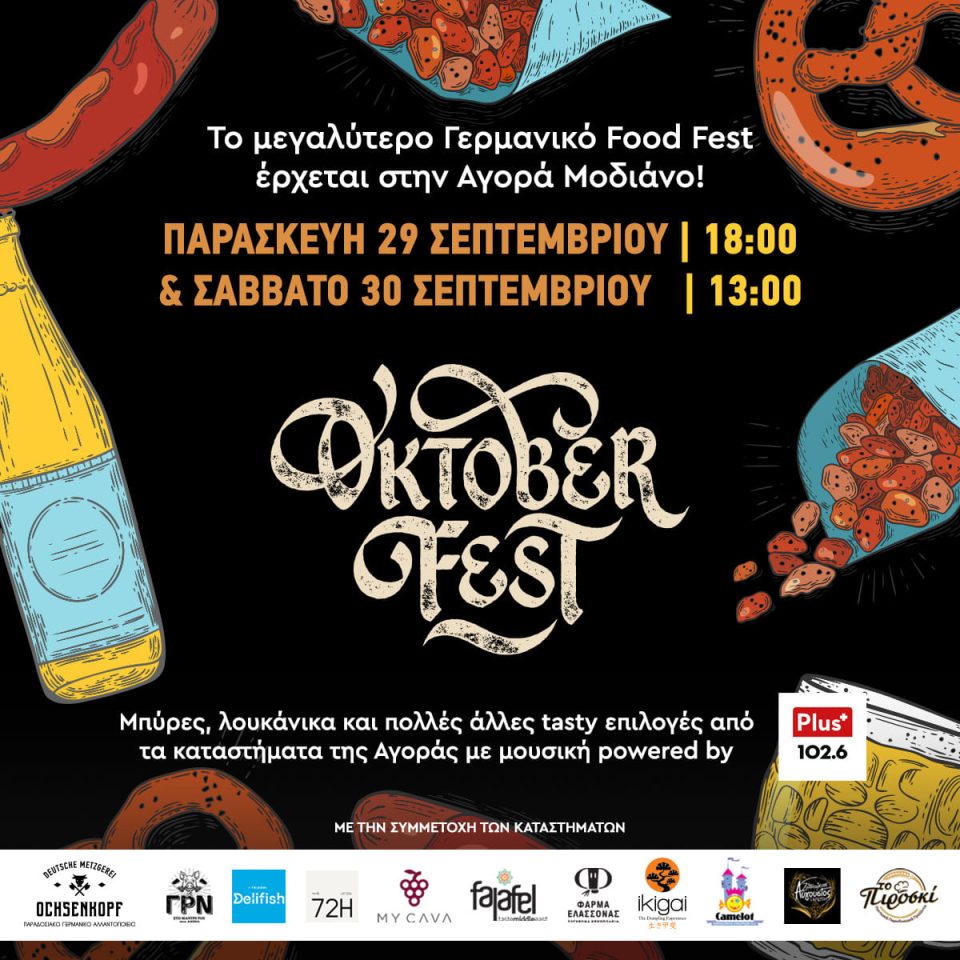 Από σήμερα, Παρασκευή 29 Σεπτεμβρίου μετά τις 18:00 και αύριο Σάββατο 30 Σεπτεμβρίου μετά τις 13:00, η στολισμένη Αγορά Μοδιάνο σας προσκαλεί να την επισκεφτείτε και να ζήσετε μία γαστριμαργική εμπειρία που θα σας μείνει αξέχαστη. Μπαλόνια και σημαίες στα χρώματα της Βαυαρίας, διακόσμηση με πρέτσελ, μπύρες και hotdogs συνθέτουν μία γιορτινή ατμόσφαιρα που είναι σίγουρο ότι θα κερδίσει τις εντυπώσεις και θα φωτογραφηθεί πολύ από μικρούς και μεγάλους.