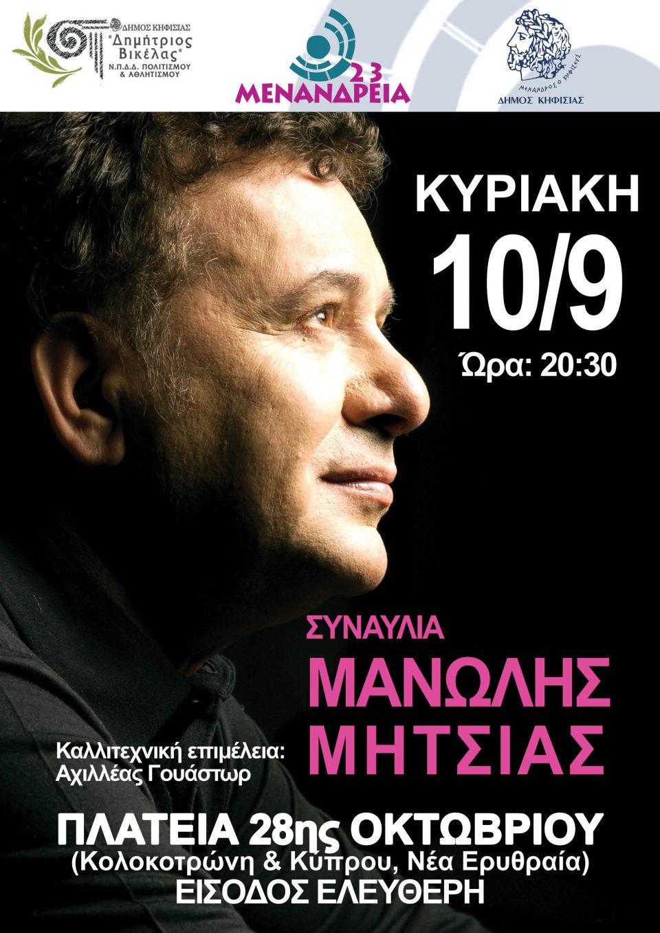 Λόγω πρόβλεψης δυσμενών καιρικών συνθηκών η προκαθορισμένη για σήμερα, Τρίτη 5 Σεπτεμβρίου συναυλία του Μανώλη Μητσιά, μεταφέρεται την Κυριακή 10 Σεπτεμβρίου, στο ίδιο σημείο Πλατεία 28ης Οκτωβρίου (Κολοκοτρώνη & Κύπρου, Νέα Ερυθραία) και ώρα 8:30 μ.μ