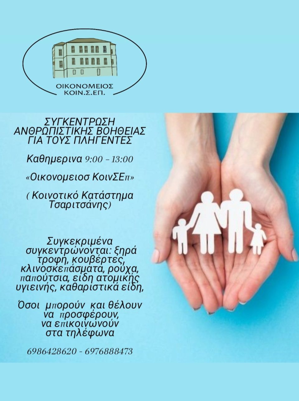 Ευελπιστώντας στην ανταπόκριση όσων το επιθυμούν και με όποιον τρόπο μπορούν, ενημερώνουμε ότι η συγκέντρωση θα γίνεται καθημερινά στα γραφεία μας, Κοινοτικό Κατάστημα Τσαριτσάνης, στο ισόγειο και ώρες από 09:00 π.μ. έως 13:00 μ.μ.