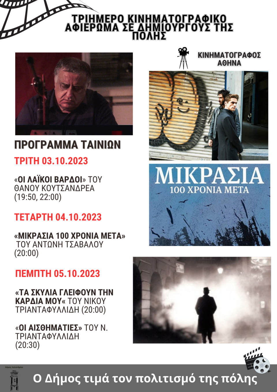 Με ένα τριήμερο κινηματογραφικό αφιέρωμα σε δημιουργούς και δημιουργίες της πόλης, καλωσορίζει τον Οκτώβριο ο Δήμος Χαλανδρίου, στην αίθουσα του κινηματογράφου Αθηνά (Σολωμού 18, Χαλάνδρι), από τις 3 έως τις 5 του μήνα.
