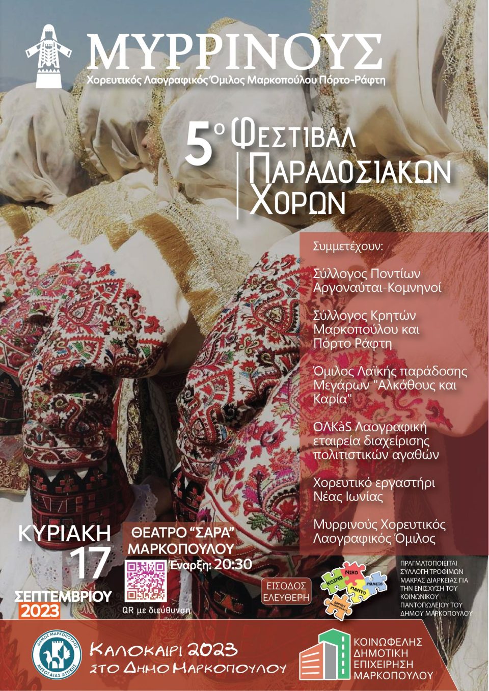 Ο Δήμος Μαρκοπούλου, η Κοινωφελής Δημοτική Επιχείρηση Μαρκοπούλου (Κ.Δ.Ε.Μ.) και ο Χορευτικός Λαογραφικός Όμιλος Μαρκοπούλου – Πόρτο Ράφτη «Μυρρινούς», σας προσκαλούν στην καθιερωμένη «γιορτή της παράδοσης», το «5ο Φεστιβάλ Παραδοσιακών Χορών», που θα πραγματοποιηθεί στο θέατρο «Σάρα» Μαρκοπούλου, την Κυριακή 17 Σεπτεμβρίου 2023.