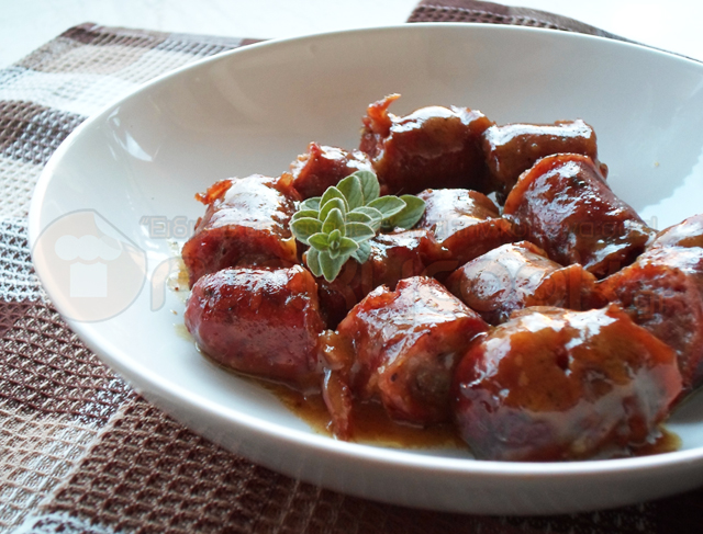 Τοποθετούμε το σκεύος στον φούρνο και ψήνουμε για 15-20 λεπτά στους 160°C Κελσίου. Σερβίρουμε τα λουκάνικα, καυτά, μέσα στην μελωμένη σάλτσα τους!