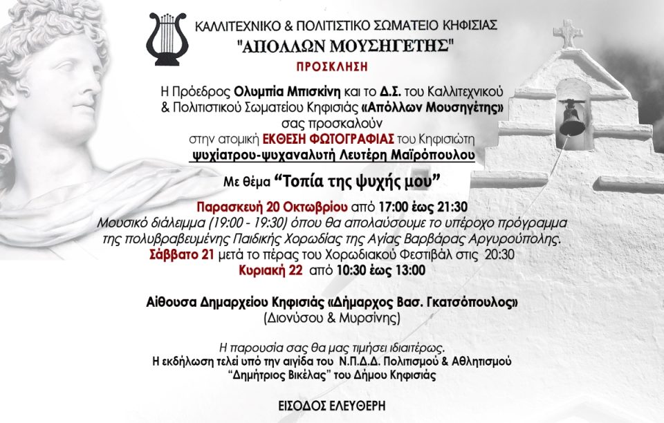 Η Πρόεδρος Ολυμπία Μπισκίνη και το Δ.Σ. του Καλλιτεχνικού & Πολιτιστικού Σωματείου Κηφισιάς «Απόλλων Μουσηγέτης» σας προσκαλούν στην ατομική ΕΚΘΕΣΗ ΦΩΤΟΓΡΑΦΙΑΣ του Κηφισιώτη ψυχίατρου-ψυχαναλυτή Λευτέρη Μαϊρόπουλου με θέμα “Τοπία της ψυχής μου”.