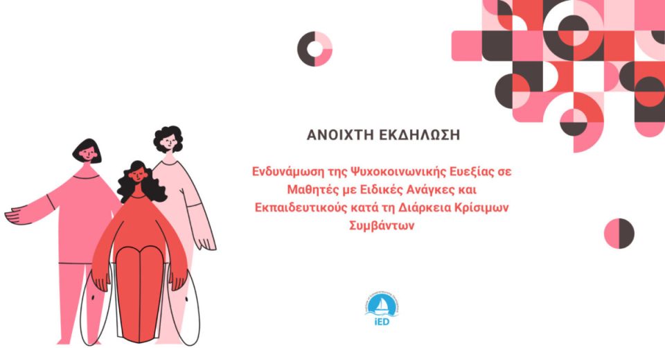 Το Ινστιτούτο Ανάπτυξης Επιχειρηματικότητας (iED) σας προσκαλεί στη διαδραστική ανοιχτή εκδήλωση με τίτλο «Ενδυνάμωση της Ψυχοκοινωνικής Ευεξία σε Μαθητές με Ειδικές Ανάγκες και Εκπαιδευτικούς κατά τη Διάρκεια Κρίσιμων Συμβάντων».