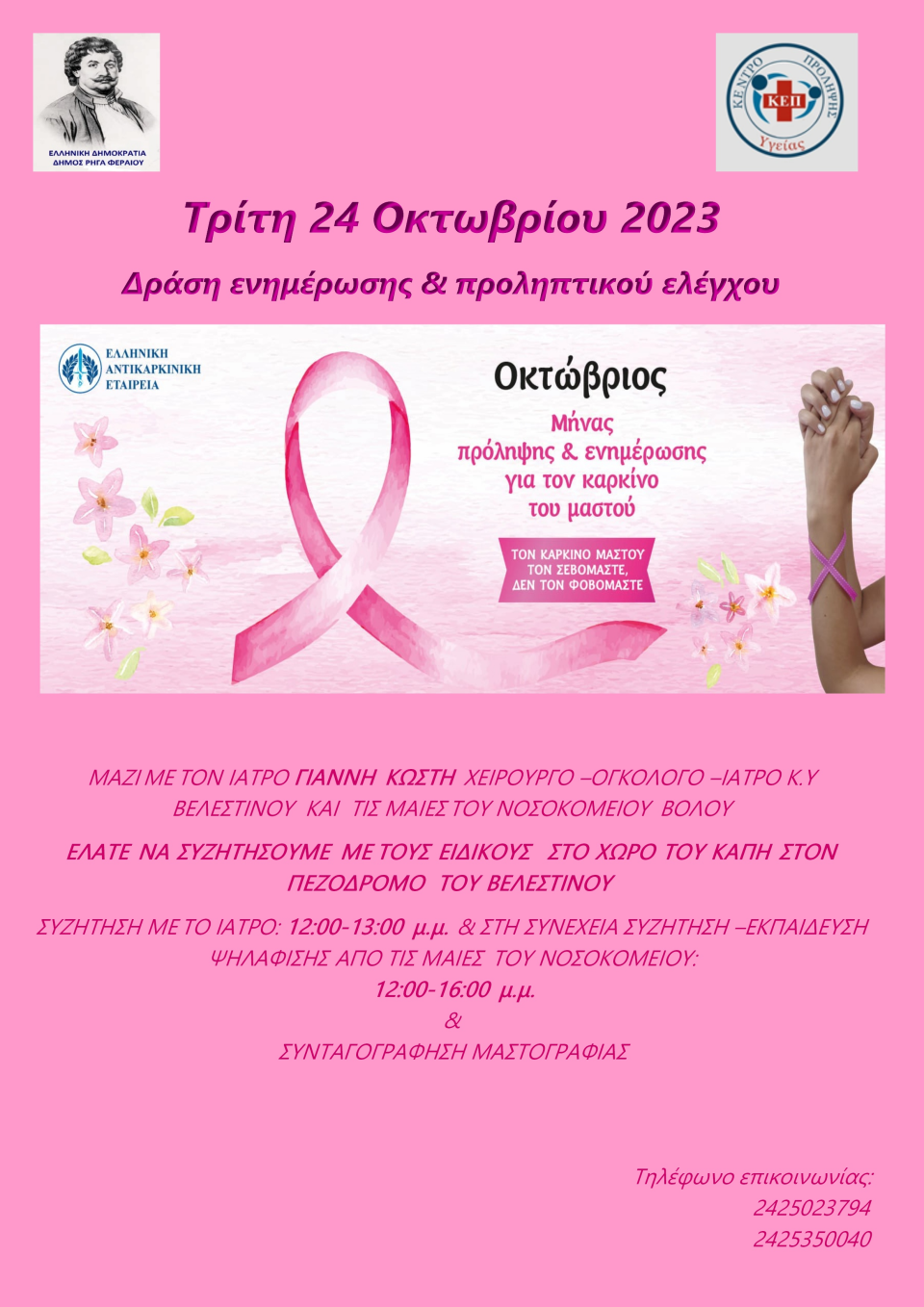 Για τη φετινή χρονιά το ΚΕΠ Υγείας του Δήμου Ρήγα Φεραίου διοργανώνει μια ανάλογη δράση ενημέρωσης και ευαισθητοποίησης του γυναικείου πληθυσμού την Τρίτη 24 Οκτώβρη στο Βελεστίνο στο χώρο του ΚΑΠΗ στον πεζόδρομο.