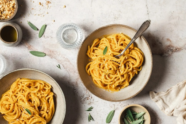 Εν τω μεταξύ μαγειρεύουμε τα ζυμαρικά σύμφωνα με τις οδηγίες της συσκευασίας. Όσο ετοιμάζονται τα ζυμαρικά, παίρνουμε μια κουτάλα από το νερό του μαγειρέματος και την προσθέτουμε στα καρότα. Ανακατεύουμε μέχρι να έχουμε μια λεία κρέμα. Προσθέτουμε σταδιακά το νερό μαγειρέματος για να αποκτήσουμε την επιθυμητή συνοχή.