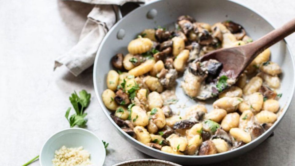Αφαιρείτε το καπάκι και προσθέτετε το σκόρδο, μαγειρεύετε για 1-2 λ, στη συνέχεια ανακατεύετε τα νιόκι στο τηγάνι. Προσθέστε από πάνω τυρί και μαϊντανό για σερβίρισμα.