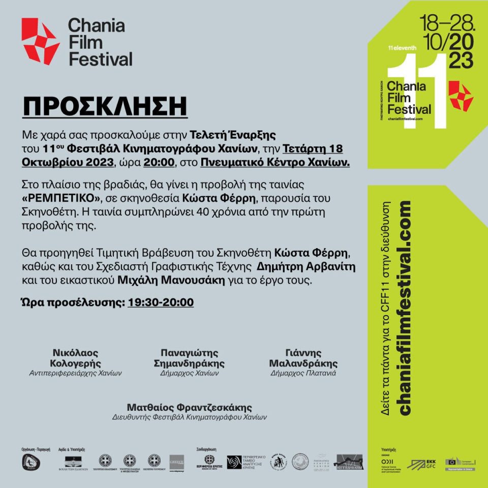 Την Τετάρτη 18 Οκτωβρίου, στις 20.00 θα πραγματοποιηθεί η τελετή έναρξης του 11ου Φεστιβάλ Κινηματογράφου Χανίων / ChaniaFilmFestival.