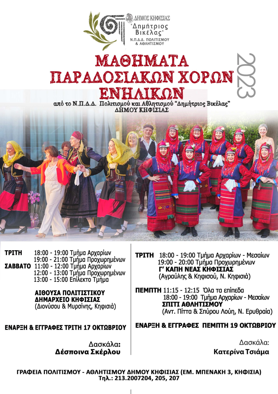 ΚεντρικήΚοινωνικάΤμήματα Παραδοσιακών χορών στο Δήμο Κηφισιάς by xristiana17 Οκτωβρίου 202317 Οκτωβρίου 20230361 Share00 17/10/2023 Πηγή: https://www.xtypos.gr