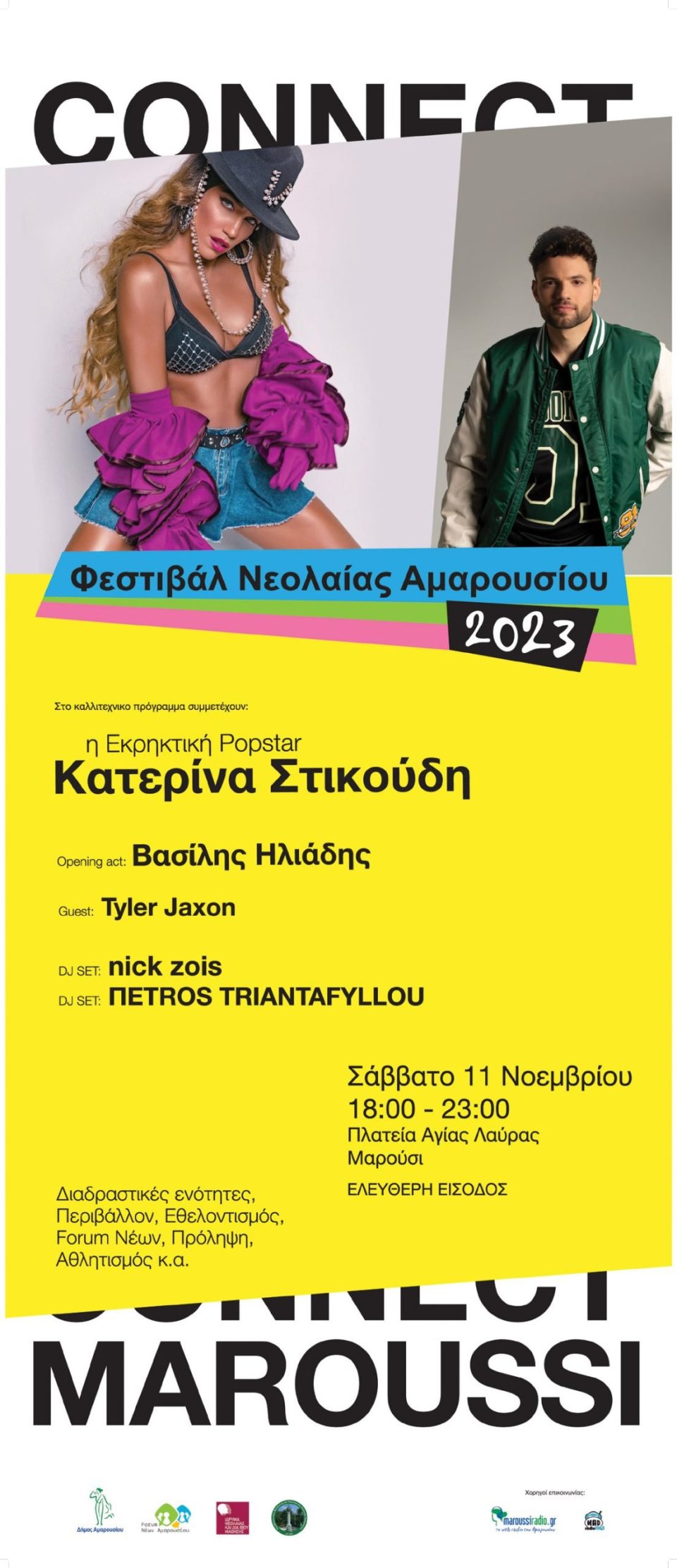 Ο Δήμος Αμαρουσίου μέσω του Γραφείου Νέας Γενιάς και Εθελοντισμού διοργανώνει το Φεστιβάλ Νεολαίας Αμαρουσίου 2023, με τίτλο: “CONNECT MAROUSSI”, το Σάββατο 11 Νοεμβρίου από τις 18:00 έως τις 23:00, στην Πλατεία Αγίας Λαύρας στο Μαρούσι.Στόχος του Φεστιβάλ Νεολαίας είναι η σύσφιξη των σχέσεων μεταξύ των νέων, η ενίσχυση της συμμετοχής τους στη διαδικασία λήψης των αποφάσεων που τους αφορούν και η προώθηση της ιδιότητάς τους ως ενεργοί πολίτες. Το Περιβάλλον, ο Εθελοντισμός, το Forum Νέων, η Πρόληψη, ο Αθλητισμός είναι διαδραστικές ενότητες που περιλαμβάνονται μεταξύ άλλων στο Φεστιβάλ.Ο Δήμαρχος Αμαρουσίου Θεόδωρος Αμπατζόγλου απευθύνει ανοικτή πρόσκληση σε όλους τους νέους της πόλης για ευρεία συμμετοχή. «Το Φεστιβάλ Νεολαίας στην πόλη μας, μας δίνει την ευκαιρία να γνωριστούμε, να ανταλλάξουμε απόψεις, να συμμετέχουμε σε πολιτιστικά δρώμενα, αλλά και να ψυχαγωγηθούμε με το πλούσιο πολιτιστικό και καλλιτεχνικό πρόγραμμα που θα παρουσιάσουν καταξιωμένοι ερμηνευτές. Είστε όλοι ευπρόσδεκτοι. Σας περιμένουμε! Την ευθύνη της διοργάνωσης έχει η Εντεταλμένη Σύμβουλος Νέας Γενιάς και Εθελοντισμού Φανή Λέκκα. Στο πλαίσιο του Φεστιβάλ, το δικό τους δυναμικό «παρών» θα δώσουν οργανώσεις, ομάδες και φορείς της πόλης και της ευρύτερης περιοχής, παρέχοντας την ευκαιρία στους παριστάμενους να ενημερωθούν για το έργο και τις δράσεις τους, παράλληλα με τη συμμετοχή τους σε διαδραστικά δρώμενα, όπως DIY Workshop με επαναχρησιμοποιημένα υφάσματα, κ.α.Αποκορύφωμα των εκδηλώσεων του Φεστιβάλ είναι η συμμετοχή της εκρηκτικής και μιας από τις πιο επιτυχημένες popstars της χώρας Κατερίνας Στικούδη, που παρουσιάζει ένα μοναδικό οπτικοακουστικό show, με εντυπωσιακά κουστούμια και χορογραφίες, πάνω σε γνωστές της και όχι μόνο viral επιτυχίες. Επίσης, συμμετέχει ο εμπνευσμένος από τη δυτική R&B σκηνή, που συνδυάζει άψογα το τραγούδι, το χορό, αλλά και την υποκριτική Βασίλης Ηλιάδης. Στο show του Βασίλη Ηλιάδη θα εμφανιστεί ως guest o MC και rapper Tyler Jackson, που θα ερμηνεύσει γνωστές αγγλόφωνες επιτυχίες.Ο Έλληνας DJ και παραγωγός nick zois και ο DJ και γνωστός ραδιοφωνικός παραγωγός ΠETROS TRIANTAFYLLOU στα DJ SET βάζουν την καλλιτεχνική τους σφραγίδα για μια μοναδική μουσική εμπειρία!