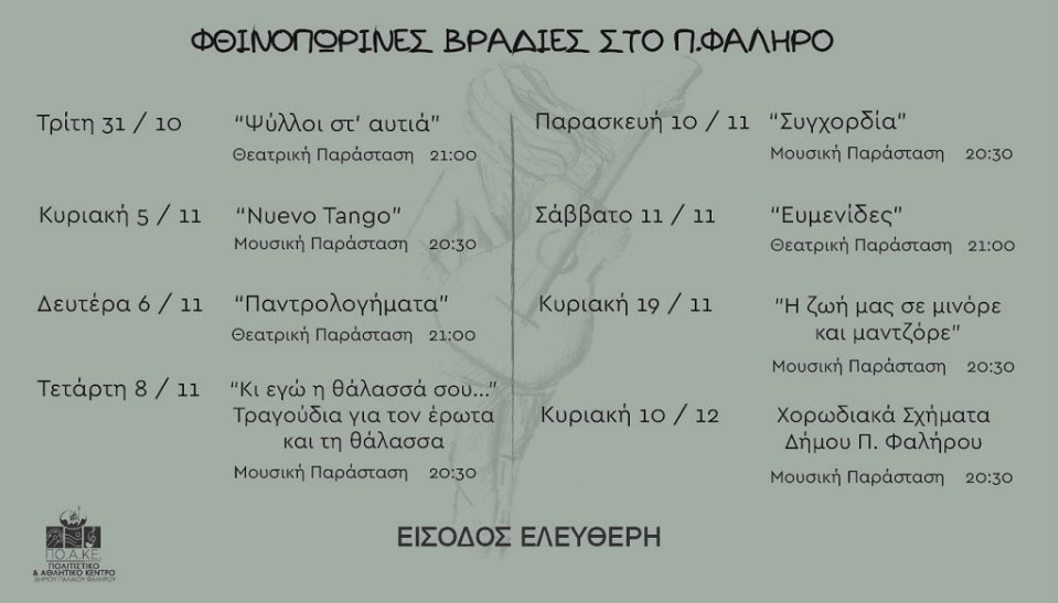 Μετά από ένα δυνατό καλλιτεχνικό καλοκαίρι, με αξέχαστες ερμηνείες και ξεχωριστές καλλιτεχνικές εμφανίσεις τις οποίες «αγκάλιασαν» και χειροκρότησαν χιλιάδες επισκέπτες, κατά τον κύκλο των φετινών «ΦΑΛΗΡΙΚΩΝ», η σκηνή του Πολυχώρου του Δημαρχείου Π. Φαλήρου, ανάβει και πάλι τα φώτα της.