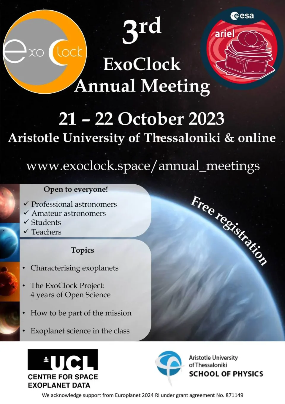 Το Σαββατοκύριακο 21-22 Οκτωβρίου 2023 θα διεξαχθεί στο Αριστοτέλειο Πανεπιστήμιο Θεσσαλονίκης (ΑΠΘ) το 3ο διεθνές συνέδριο του προγράμματος ExoClock. Το ExoClock αποτελεί μέρος της διαστημικής αποστολής Ariel του Ευρωπαϊκού Οργανισμού Διαστήματος (ESA).
