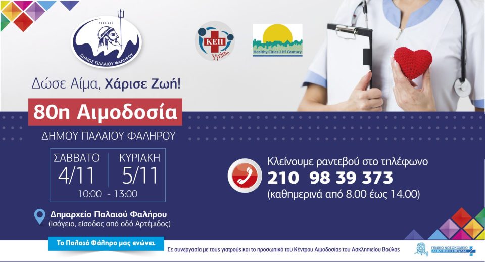 Ο Δήμος Παλαιού Φαλήρου σε συνεργασία με τους γιατρούς και το προσωπικό του Κέντρου Αιμοδοσίας του Ασκληπιείου Βούλας, διοργανώνει την 80η Εθελοντική Αιμοδοσία του,Τo Σάββατο 4 Νοεμβρίου 2023 και την Κυριακή 5 Νοέμβριου 2023, από 10:00 έως 13.00, στο ισόγειο του Δημαρχείου Παλαιού Φαλήρου (Είσοδος από Αρτέμιδος).