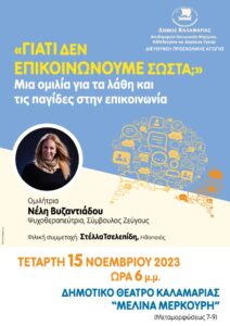 Μία ενδιαφέρουσα διαδραστική ομιλία για τα λάθη και τις παγίδες στην επικοινωνία, διοργανώνει η Δ/νση Προσχολικής Αγωγής, της Αντιδημαρχίας Μέριμνας, Αλληλεγγύης και Δημόσιας Υγείας του Δήμου Καλαμαριάς, την Τετάρτη 15 Νοεμβρίου 2023 και ώρα 18:00 στο Δημοτικό Θέατρο «Μελίνα Μερκούρη».