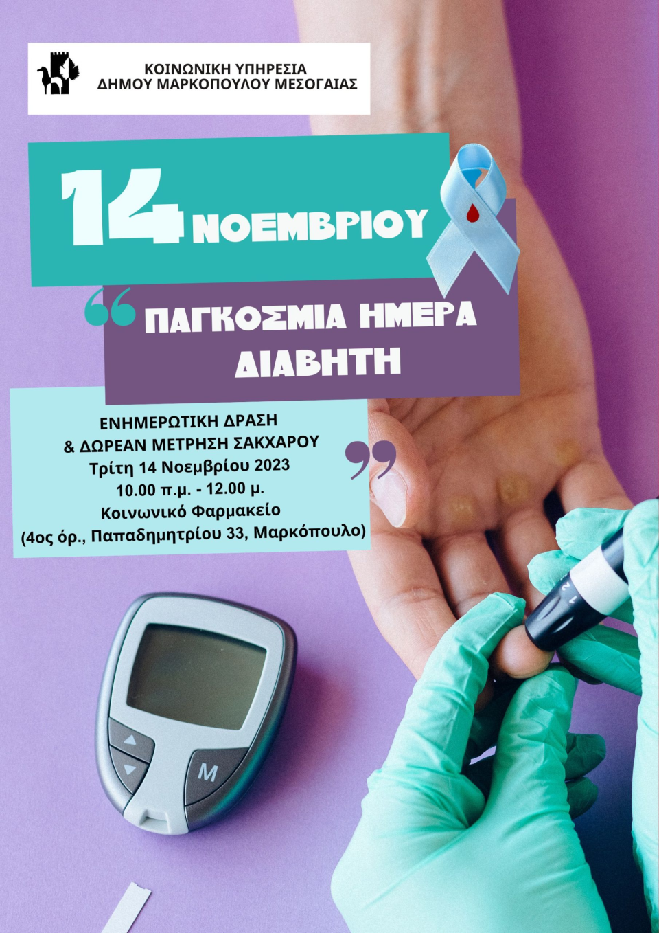 Σε αυτό το πλαίσιο ευαισθητοποίησης και ενημέρωσης η Κοινωνική Υπηρεσία του Δήμου Μαρκοπούλου καλεί το κοινό την Τρίτη 14 Νοεμβρίου 2023, από τις 10.00 π.μ. έως τις 12.00 μ. στο Κοινωνικό Φαρμακείο του Δήμου (4ος όροφος, οδός Παπαδημητρίου 33, Μαρκόπουλο), για να ενημερωθεί για το διαβήτη και όποιος επιθυμεί, να προβεί σε μέτρηση σακχάρου.