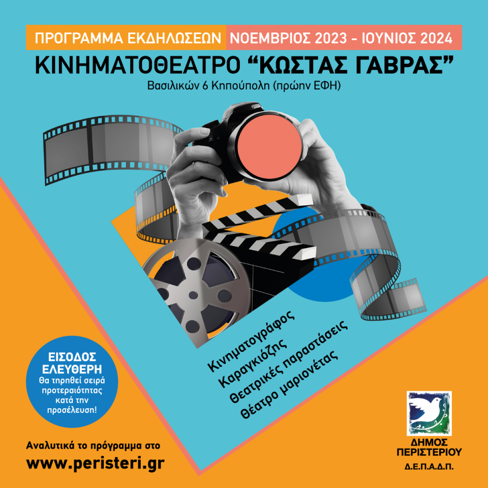 Ο Δήμαρχος Περιστερίου Ανδρέας Παχατουρίδης, στο μήνυμά του, τονίζει: «Το ομώνυμο µε τον κ. Κώστα Γαβρά κινηματοθέατρο, ανοίγει αυλαία λειτουργίας, προβολών και παραστάσεων, προς όλους τους πολίτες του Περιστερίου και όχι µόνον, για τη χρονική περίοδο «Νοέμβριος 2023 – Ιούνιος 2024», τελείως δωρεάν.