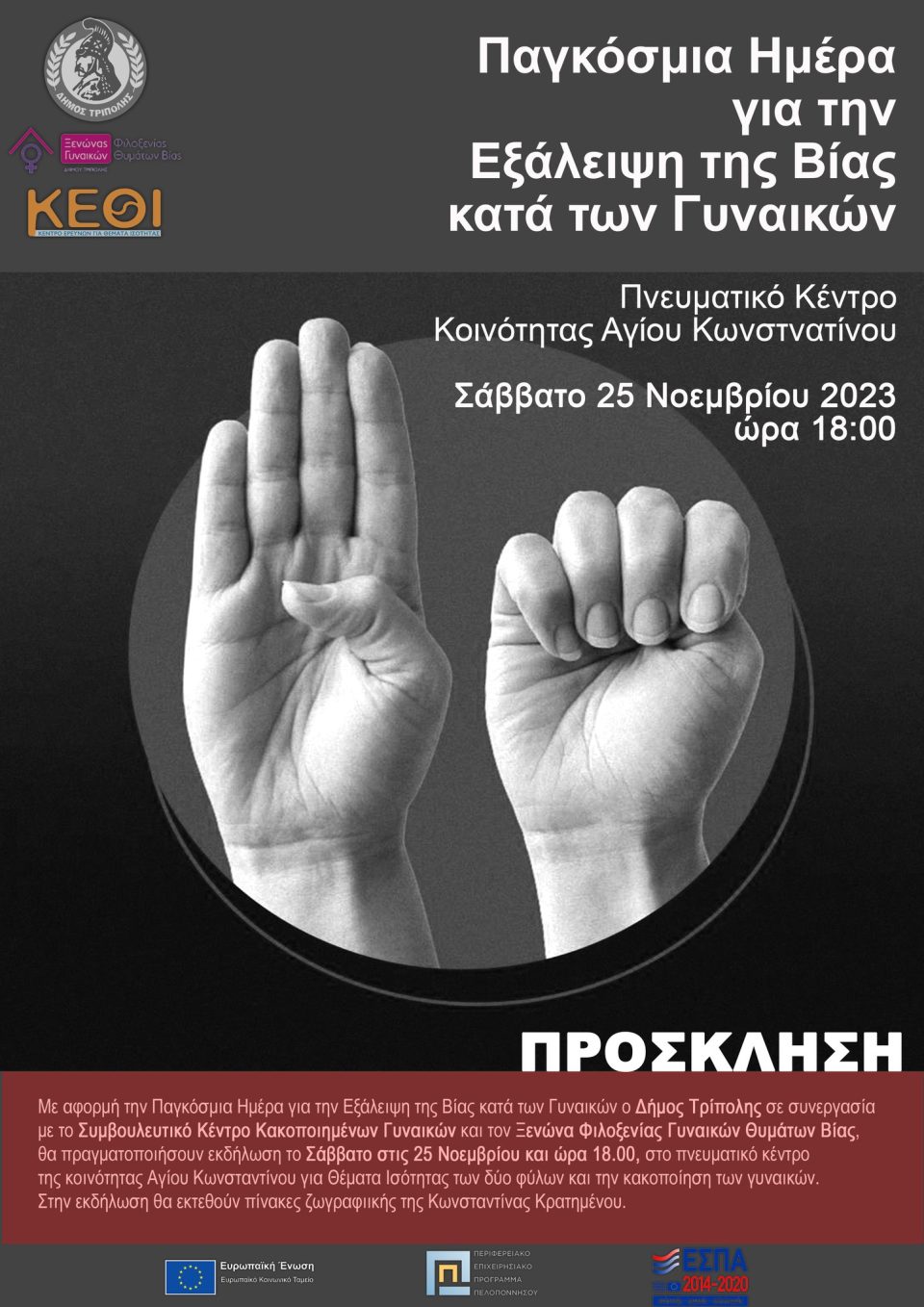 Με αφορμή την Παγκόσμια Ημέρα για την Εξάλειψη της Βίας κατά των Γυναικών, ο Δήμος Τρίπολης, σε συνεργασία με το Συμβουλευτικό Κέντρο Κακοποιημένων Γυναικών και τον Ξενώνα Φιλοξενίας Γυναικών Θυμάτων Βίας, θα πραγματοποιήσουν εκδήλωση το Σάββατο στις 25 Νοεμβρίου και ώρα 18.00, στο πνευματικό κέντρο της κοινότητας Αγίου Κωνσταντίνου, για Θέματα Ισότητας των δύο φύλων και την κακοποίηση των γυναικών.