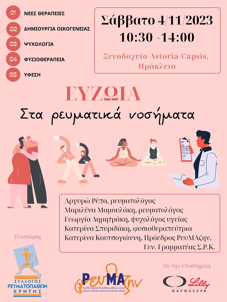Ομιλήτριες της εκδήλωσης θα είναι οι κκ. Ρέπα Αργυρώ, Επιμελήτρια Α΄, Ρευματολογική Κλινική ΠΑΓΝΗ, Μαμουλάκη Μαριλένα, ειδικός ρευματολόγος, Σπυριδάκη Κατερίνα, φυσιοθεραπεύτρια, Δημητράκη Γεωργία, ψυχολόγος υγείας και Κατερίνα Κουτσογιάννη, Πρόεδρος ΡευΜΑζην – Γεν. Γραμματέας Σ.Ρ.Κ.