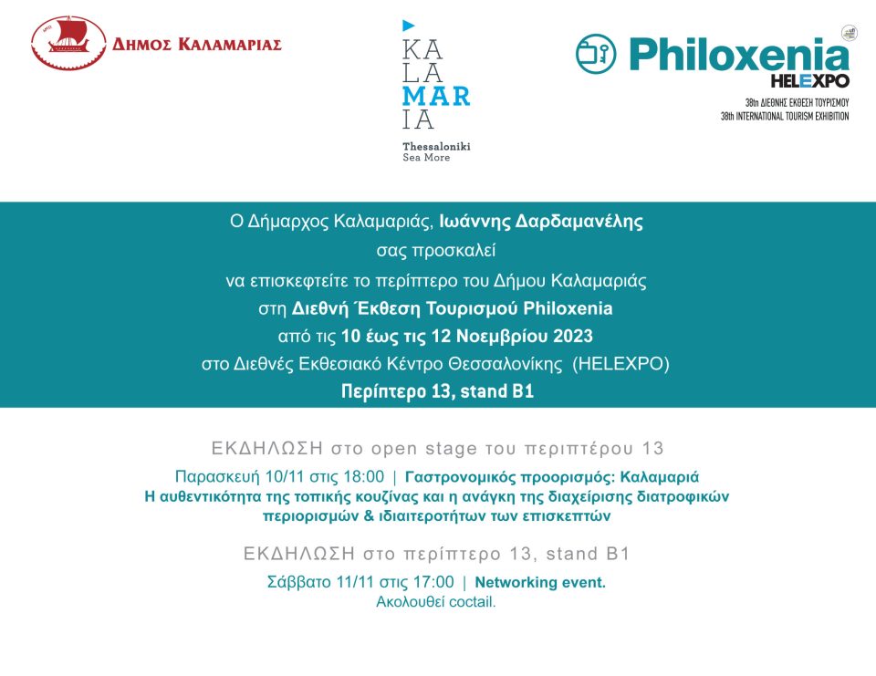 Για τρίτη συνεχόμενη χρονιά ο Δήμος Καλαμαριάς συμμετέχει στη Διεθνή Έκθεση Τουρισμού «Philoxenia», που ανοίγει τις πύλες της την Παρασκευή 10 Νοεμβρίου 2023.