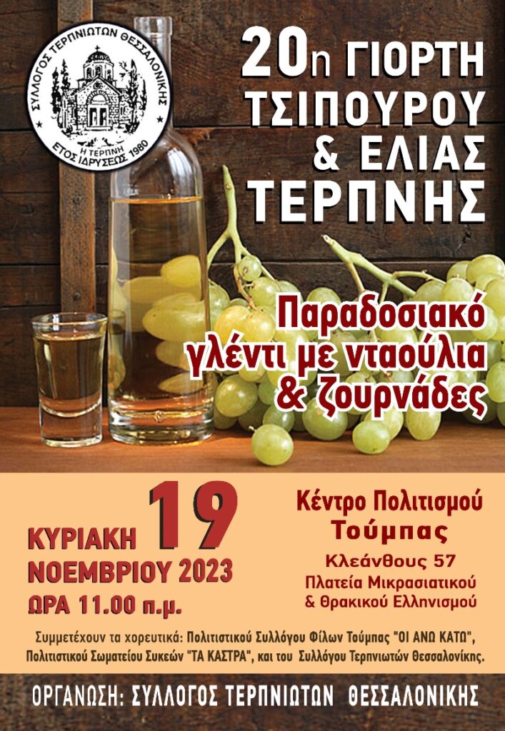 Μεγάλο γλέντι στην Τούμπα με την Γιορτή Τσίπουρου και Ελιάς Τέρπνης να είναι προγραμματισμένη για την Κυριακή 19 Νοεμβρίου 2023 από τις 11 το πρωί στο χώρο μπροστά από το Κέντρο Πολιτισμού Τούμπας Κλεάνθους 57, (Πλατεία Μικρασιατικού & Θρακικού Ελληνισμού).