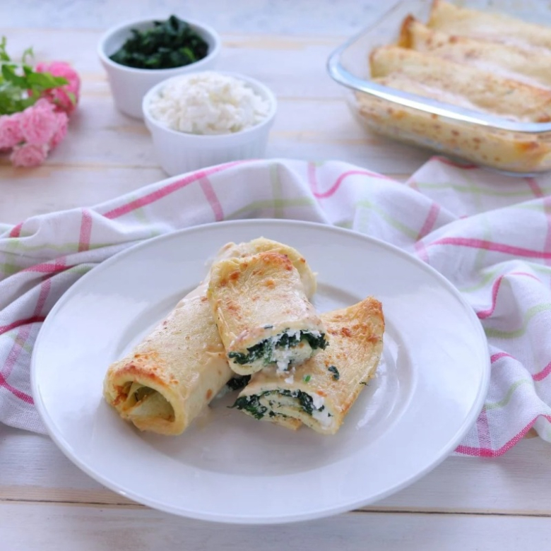 Παίρνουμε ένα ταψί και βάζουμε στον πάτο με λίγη μπεσαμέλ. Τώρα απλώνουμε τη μπεσαμέλ και στις κρέπες, μια κουταλιά γέμιση σε κάθε κρέπα και στη συνέχεια τις κλείνουμε τις κρέπες και τις τοποθετούμε στο ταψί. Στη συνέχεια ρίχνουμε την υπόλοιπη σάλτσα μπεσαμέλ να καλυφθούν όλες οι κρέπες και τελειώνουμε με τριμμένο τυρί. Τοποθετούμε το ταψί στον φούρνο και ψήνουμε στους 180-190°C για περίπου 30 λεπτά.