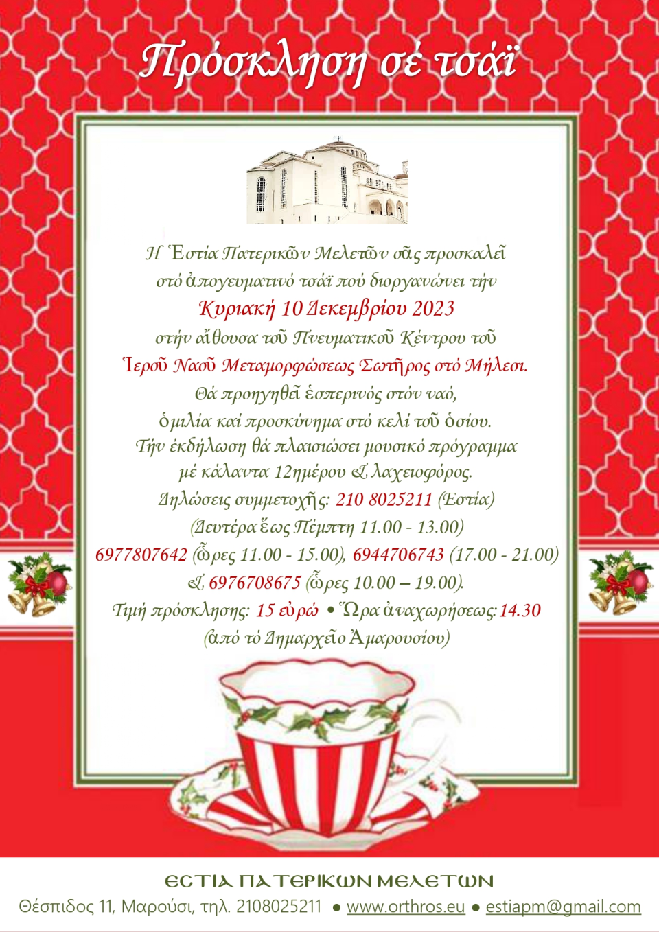 Η Ἑστία Πατερικῶν Μελετῶν σᾶς προσκαλεῖ στό ἀπογευματινό τσάϊ πού διοργανώνει τήν Κυριακή 10 Δεκεμβρίου 2023 στήν αἴθουσα τοῦ Πνευματικοῦ Κέντρου τοῦ Ἱεροῦ Ναοῦ Μεταμορφώσεως Σωτῆρος στό Μήλεσι.