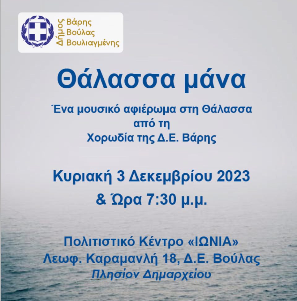 Ο Δήμος Βάρης Βούλας Βουλιαγμένης σας προσκαλεί την Κυριακή 3 Δεκεμβρίου και ώρα 10.30 στο Πολιτιστικό Κέντρο «ΙΩΝΙΑ» σε μία μοναδική μουσική βραδιά- αφιέρωμα στη θάλασσα, με τίτλο «Θάλασσα Μάνα».