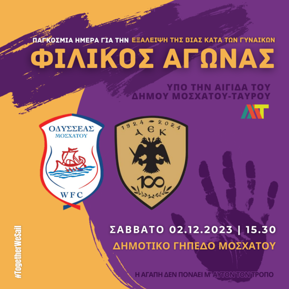 Το Σάββατο, 02 Δεκεμβρίου 2023, στις 15.30, θα διεξαχθεί φιλικός αγώνας ποδοσφαίρου μεταξύ των γυναικείων ποδοσφαιρικών ομάδων «Οδυσσέας Μοσχάτου» και ΑΕΚ.