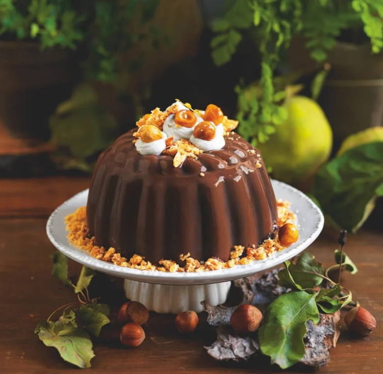 Ξεφορμάρουμε την πουτίγκα και τη διακοσμούμε με την καραμέλα, με την καραμέλα και τα υπόλοιπα ψιλοκομμένα φουντούκια.