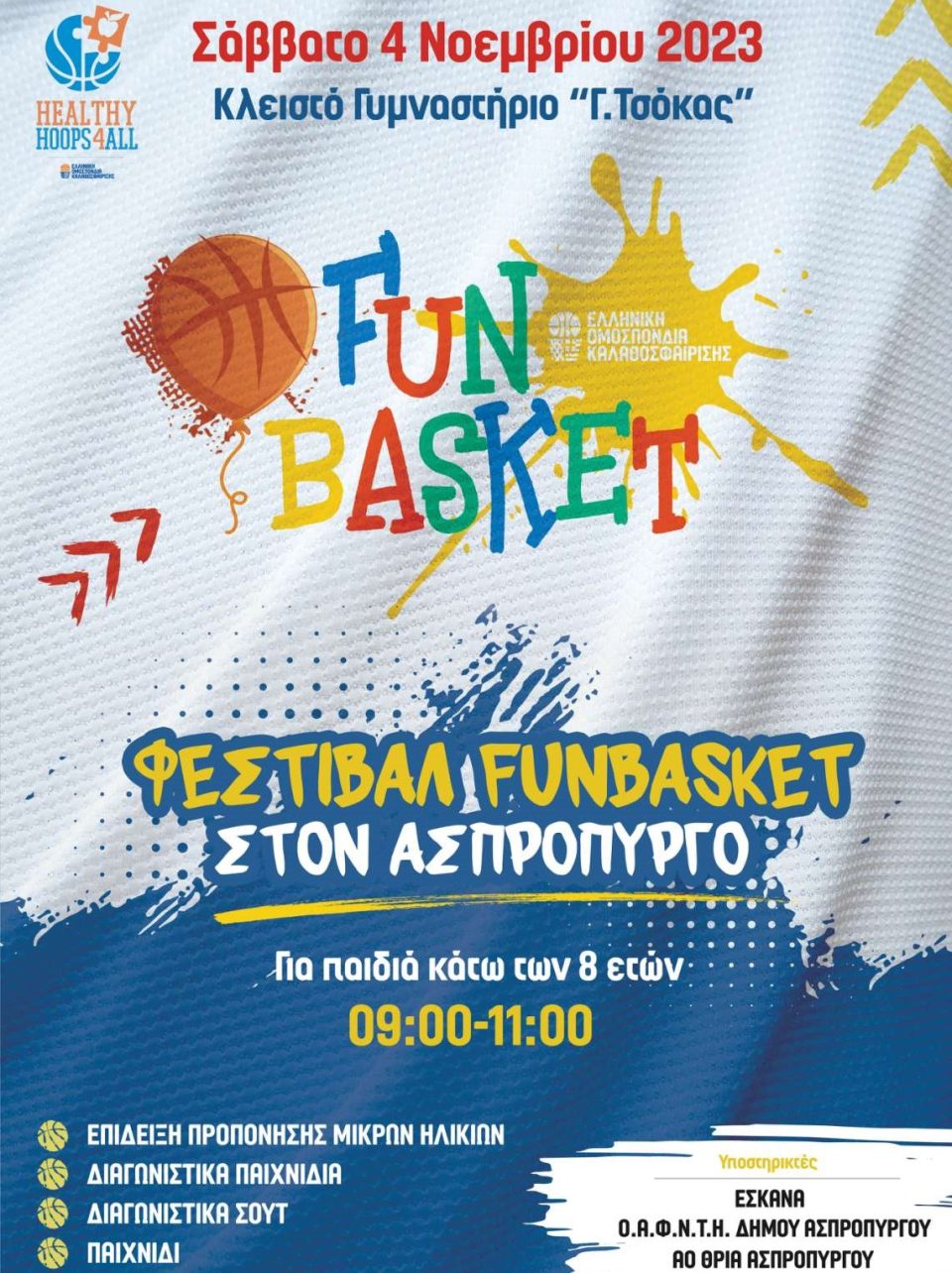 Μια ακόμη αθλητική διοργάνωση το «ΦΕΣΤΙΒΑΛ FUNBASKET» φιλοξενείται στο Κλειστό Γυμναστήριο «Γεώργιος Θ. Τσόκας», το Σάββατο 4 Νοεμβρίου 2023, 09:00- 11:00, που πραγματοποιεί η Ελληνική Ομοσπονδία Καλαθοσφαίρισης (ΕΟΚ) σε συνεργασία με την ΕΣΚΑΝΑ, τον Οργανισμό Άθλησης και Φροντίδας, Νεολαίας και Τρίτης Ηλικίας και του ΑΟ ΘΡΙΑ Ασπροπύργου.