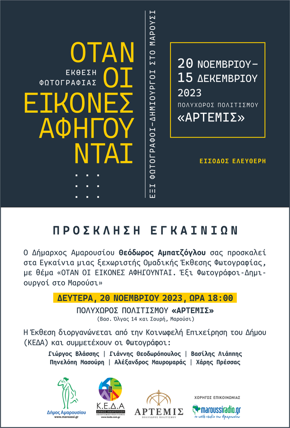 Ο Δήμαρχος Αμαρουσίου Θεόδωρος Αμπατζόγλου σας προσκαλεί στα Εγκαίνια μιας ξεχωριστής Ομαδικής Έκθεσης Φωτογραφίας, με τίτλο: «ΟΤΑΝ ΟΙ ΕΙΚΟΝΕΣ ΑΦΗΓΟΥΝΤΑΙ, Έξι Φωτογράφοι-Δημιουργοί στο Μαρούσι», που θα πραγματοποιηθούν τη Δευτέρα, 20 Νοεμβρίου 2023, ώρα 18.00 στον Πολυχώρο Πολιτισμού «Άρτεμις» (Βασ. Όλγας 14 και Σουρή, Μαρούσι).