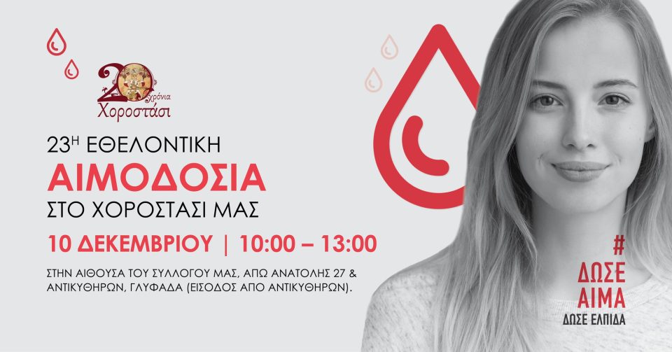 Το Χοροστάσι μας λοιπόν, με υπερηφάνεια, διοργανώνει την 23η Εθελοντική Αιμοδοσία του, την Κυριακή 10 Δεκεμβρίου 2023 και ώρες 10:00-13:00 στα γραφεία του Χοροστασίου (Άπω Ανατολής 27 και Αντικυθήρων).