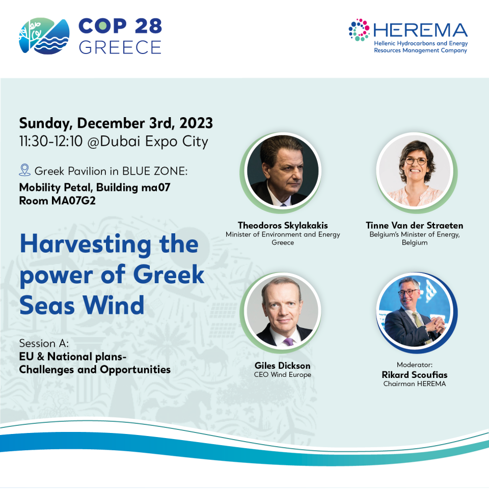 Στα πλαίσια της ελληνικής συμμετοχής, η ΕΔΕΥΕΠ διοργανώνει ειδική εκδήλωση την Κυριακή 3 Δεκεμβρίου και ώρα Ελλάδος 09:30 – 11:00 με τίτλο «Harvesting the Wind Power of Greek Seas». Διαθέτοντας ένα πολύ ελκυστικό θαλάσσιο δυναμικό και στρατηγική θέση στο σταυροδρόμι της Ευρώπης, της Ασίας και της Αφρικής, η δέσμευση της Ελλάδας για αξιοποίηση της υπεράκτιας αιολικής ενέργειας μπορεί να προσφέρει πολύ περισσότερα από την εθνική μας ενεργειακή αυτονομία. Προσφέρει τη δυνατότητα προώθησης και αξιοποίησης νέων τεχνολογιών, τη δημιουργία εγχώριας τεχνογνωσίας και την ανάπτυξη της απαραίτητης εφοδιαστικής αλυσίδας.