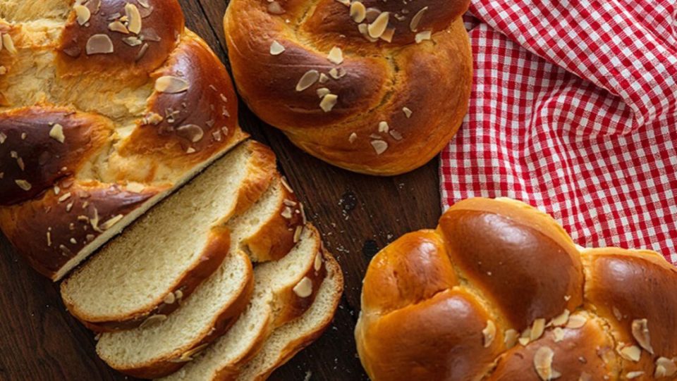 Βγάλτε τη ζύμη από το μπολ και σε μία ελαφρά αλευρωμένη επιφάνεια ζυμώστε ελάχιστα και χωρίστε τη σε έξι μερίδες. Σχηματίστε την καθεμία μερίδα σε τρεις λωρίδες, τοποθετήστε σε ένα λαδωμένο ταψί και πλέξτε τες. Επαναλάβετε με την υπόλοιπη ζύμη.
