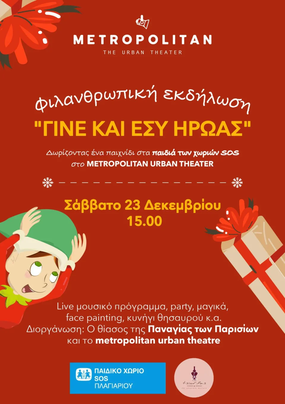 Το Σάββατο 23 Δεκεμβρίου, το θέατρο Metropolitan και ο θίασος της παράστασης «Η Παναγία των Παρισίων» προ(σ)καλούν μικρούς και μεγάλους να γίνουν ήρωες των φετινών Χριστουγέννων, χαρίζοντας ένα παιχνίδι (καινούριο ή σε άριστη κατάσταση) στα παιδιά των Παιδικών Χωριών SOS.