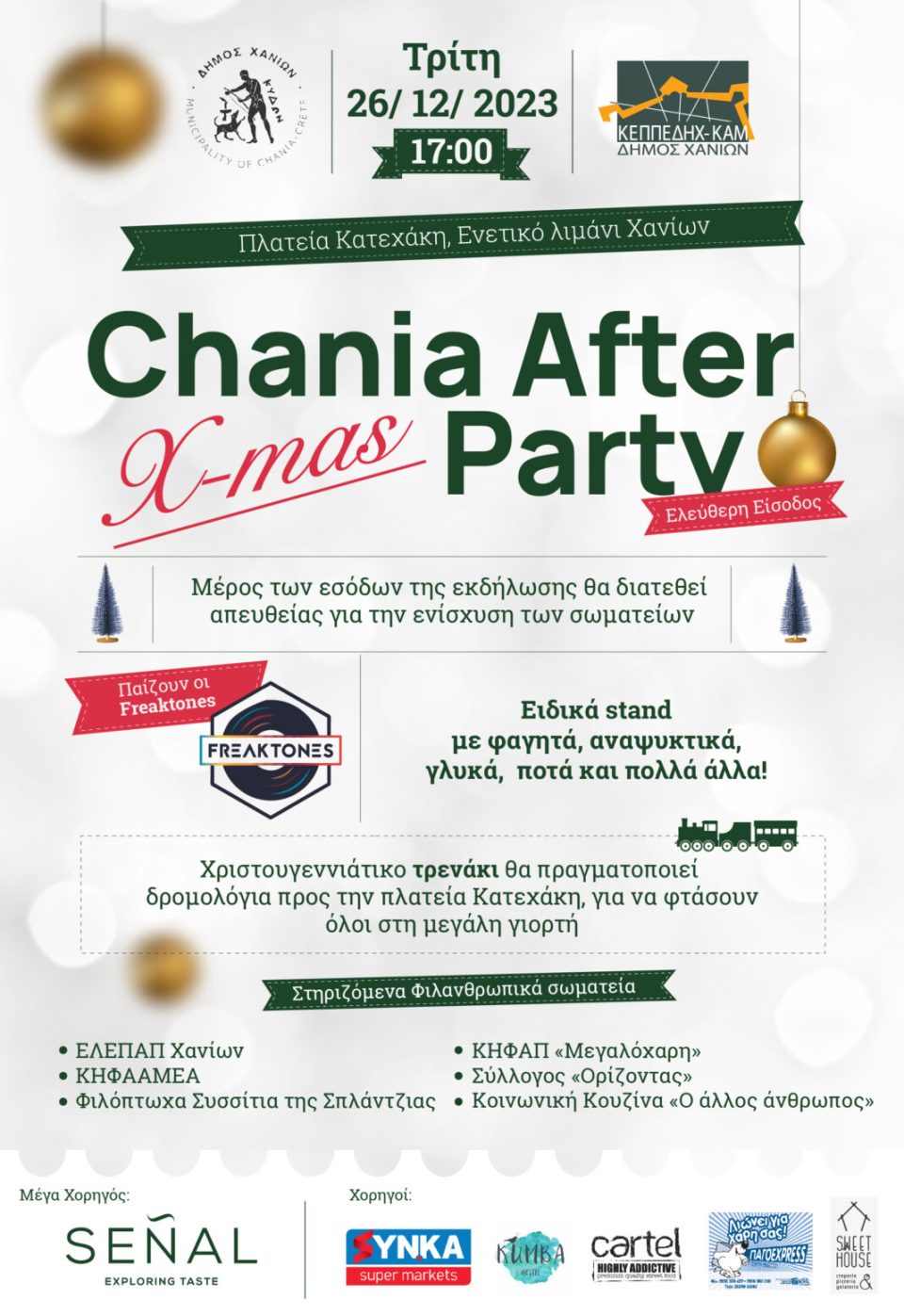 Την Τρίτη 26 Δεκεμβρίου 2023, μετά τις 17:00 ξεκινάει το μεγάλο πάρτυ της αγάπης και της προσφοράς, με ξέφρενο χορό, μουσική, τραγούδι και διασκέδαση. Οι Freaktones έρχονται να μας ξεσηκώσουν και να πλημμυρίσουν την πλατεία Κατεχάκη με γιορτινές -και όχι μόνο- μελωδίες, σε μία μοναδική, μεγάλη συναυλία.
